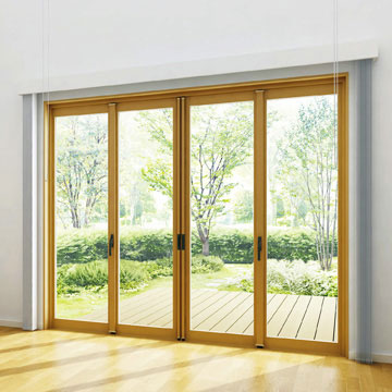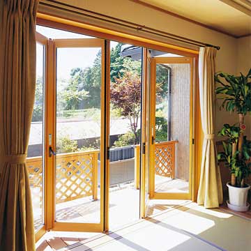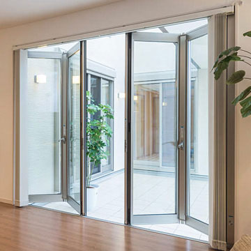 ガラス戸を両側にたたむことで開放感ある広がりを生む全開放サッシです。