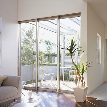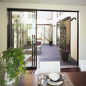 ガラス戸を両側にたたむことで、住まいの内と外をひとつにするオープンスペースを実現。